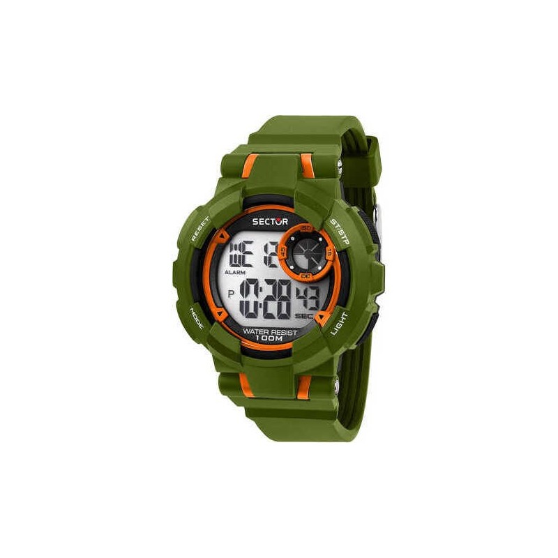 Montre-bracelet pour homme Sector de la collection ex-36 avec mouvement à quartz numérique. Boîtier rond en polycarbonate vert d'un diamètre de 45 mm, cadran numérique analogique noir. Bracelet en polyuréthane thermoplastique vert avec fermeture à boucle ardillon, étanche 10 ATM.