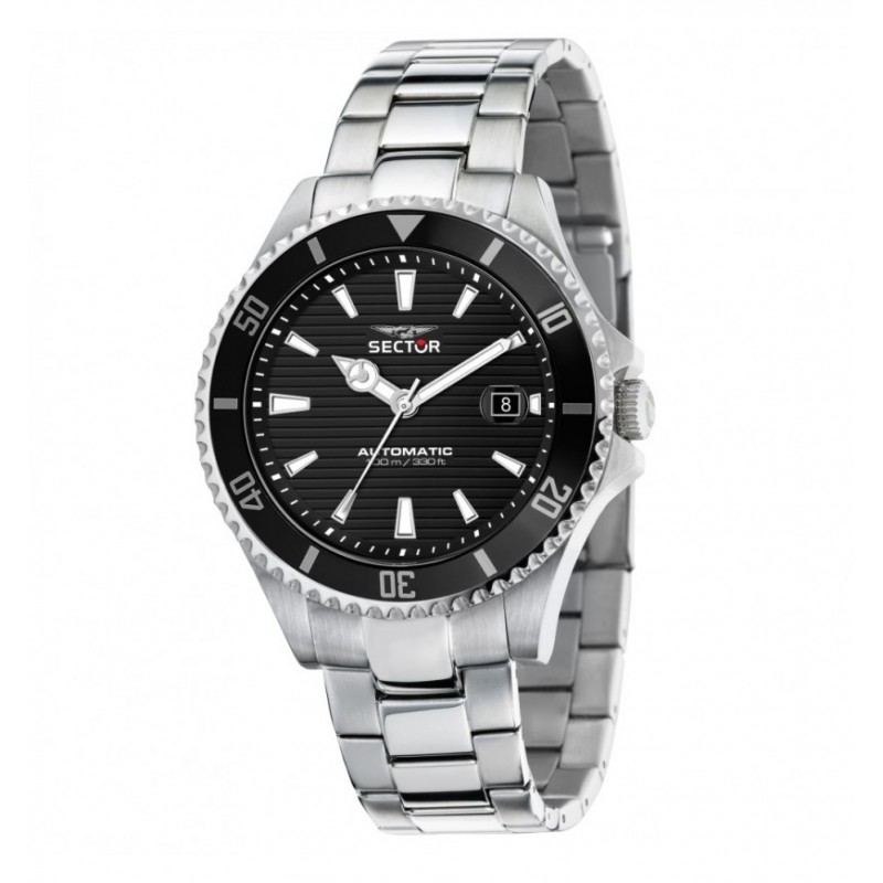 Montre-bracelet pour homme Sector de la collection 230 Automatic avec mouvement automatique NH35 et fonction heure seule avec date. Lunette en céramique noire. Cadran analogique noir avec index bâtons, logo en haut et affichage de la date à 3h avec loupe. Verre saphir. Bracelet en acier inoxydable argenté avec boucle déployante à bouton-poussoir, résistant à l'eau 10 ATM.