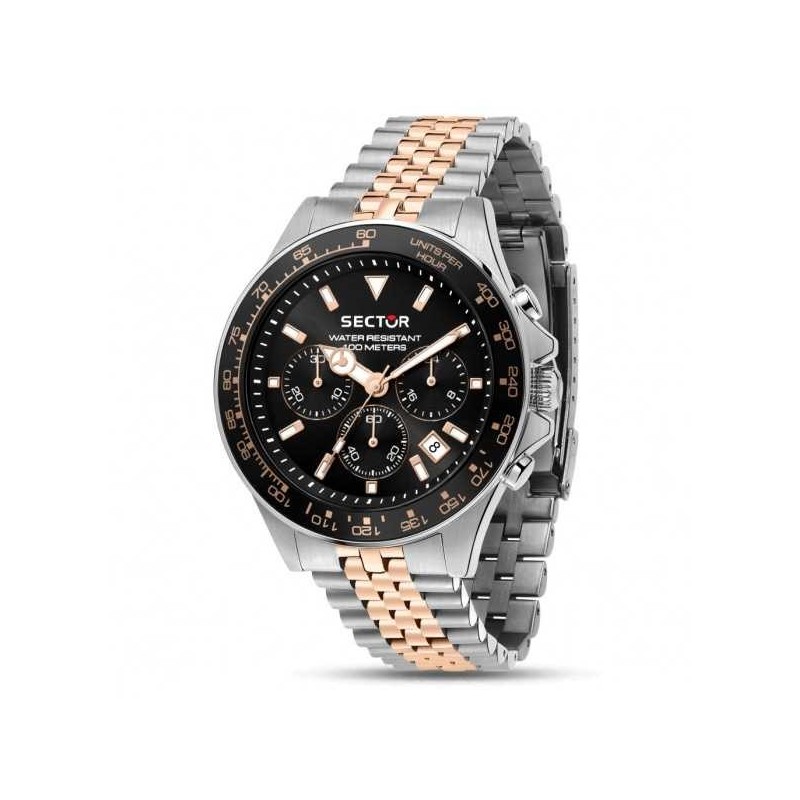 Montre-bracelet pour homme Sector de la collection 230 avec mouvement à quartz et fonction chronographe avec date. Boîtier de forme ronde en acier inoxydable argenté mesurant 43 mm de diamètre et 11,80 mm d'épaisseur, lunette en acier noir. Cadran analogique noir avec index bâtons, détails dorés, logo en haut et affichage de la date entre 4 et 5 heures, verre minéral. Bracelet en acier inoxydable à maille jubilé bicolore argent et or rose avec boucle déployante et verrou de sécurité, résistant à l'eau 10 ATM.