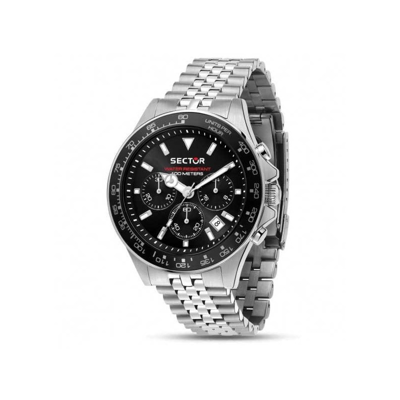 Montre-bracelet pour homme Sector de la collection 230 avec mouvement à quartz et fonction chronographe avec date. Boîtier de forme ronde en acier inoxydable argenté mesurant 43 mm de diamètre et 11,80 mm d'épaisseur, lunette en acier noir. Cadran analogique noir avec index bâtons, logo en haut et affichage de la date entre 4 et 5 heures, verre minéral. Bracelet en maille jubilé en acier inoxydable argenté avec boucle déployante, résistant à l'eau 10 m ATM.