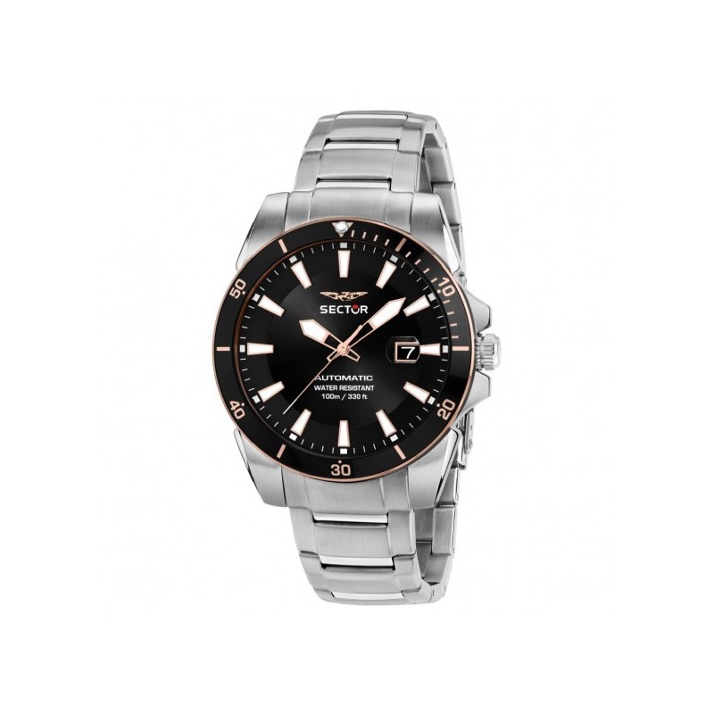 Montre-bracelet pour homme Sector de la collection 450, à mouvement automatique, affichant l'heure et la date. Boîtier rond en acier inoxydable argenté de 41 mm de diamètre et 12,75 mm d'épaisseur. Lunette plaquée or rose avec finition noire. Cadran analogique noir avec index bâtons, logo en haut et guichet de date à 3 heures. Verre minéral.