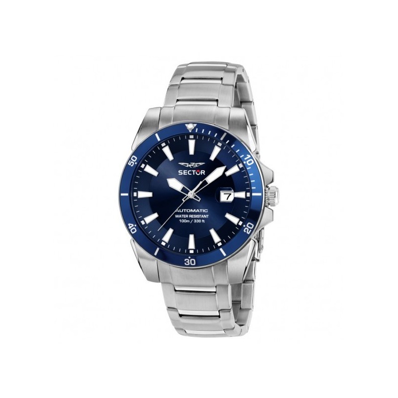 Montre-bracelet pour homme Sector de la collection 450, à mouvement automatique, affichant l'heure et la date. Boîtier rond en acier inoxydable argenté, 41 mm de diamètre et 12,75 mm d'épaisseur. Lunette bleuie.