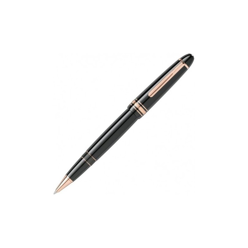 Stylo à bille Mont Blanc de la collection Meisterstück en résine noire précieuse. Le corps et le capuchon en résine noire portent l'emblème Montblanc incrusté en blanc sur le dessus du capuchon, le clip présente une finition couleur or rose et un numéro de série individuel, le système d'écriture est de type roller, les dimensions correspondent à 14,5 x 1,5 cm, tandis que le poids à 35,91 grammes.