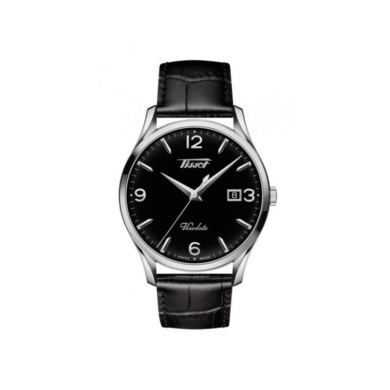Montre Tissot pour homme de la collection Heritage Visodate avec mouvement à quartz suisse et fonction heure seule avec date. Boîtier en acier inoxydable argenté de 40 mm de diamètre, cadran analogique noir avec index bâtons et chiffres arabes mixtes argentés, affichage de la date à 3 heures, verre saphir. Bracelet en cuir noir avec fermeture à boucle ardillon, étanche 3 ATM : résiste aux éclaboussures d'eau mais pas à la pression.