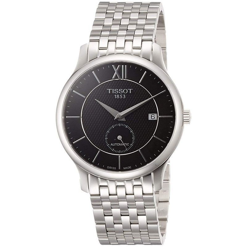 Montre Tissot pour homme de la collection T-Classic avec mouvement automatique suisse et fonction heure seule avec date. Boîtier en acier inoxydable argenté de 42 mm de diamètre, fond en verre transparent, cadran analogique noir avec index bâton argentés et chiffres romains à la position 12 uniquement, affichage de la date à 3 heures, verre saphir résistant aux rayures. Bracelet en acier inoxydable argenté avec fermoir papillon à bouton-poussoir, étanche à 3 ATM : résistant aux éclaboussures d'eau mais pas sous pression.