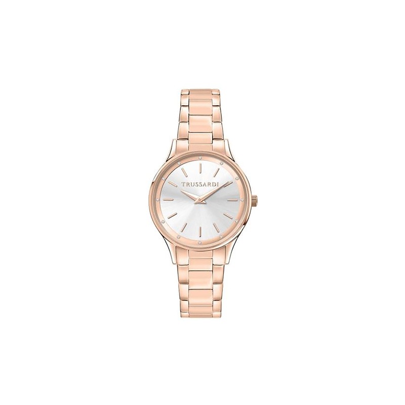 Montre femme à affichage de l'heure uniquement, issue de la collection Trussardi T-Star. Elle possède un boîtier de 34 mm en acier inoxydable doré rose et un bracelet Oyster en métal doré rose avec boucle déployante à double bouton-poussoir.