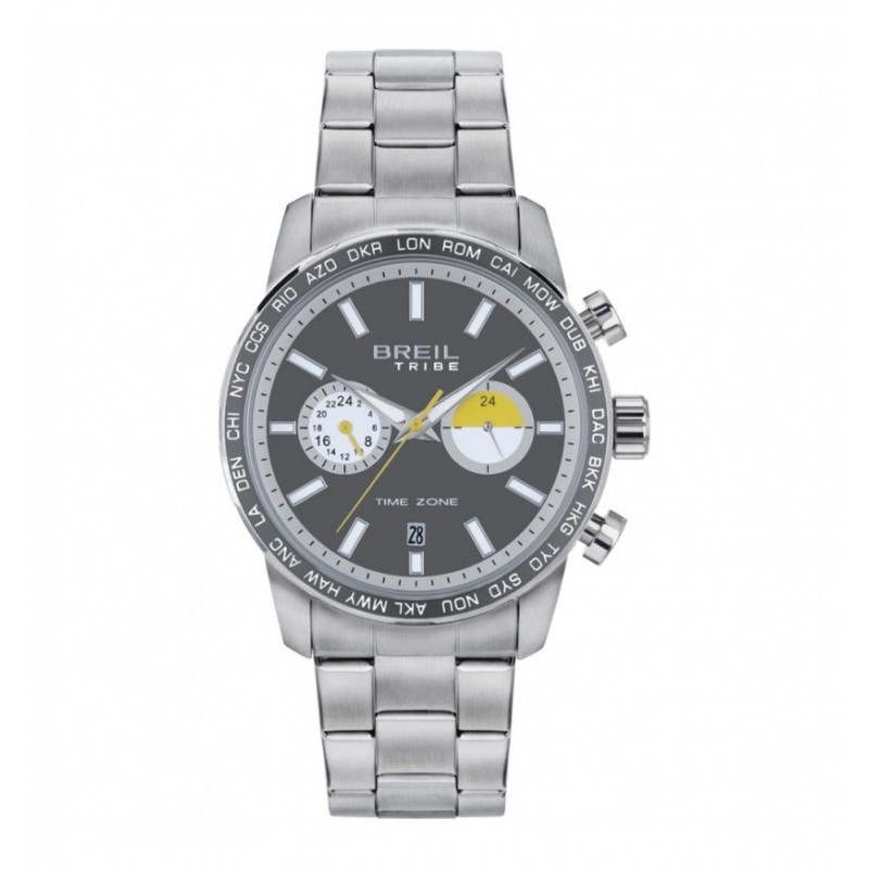 Orologio dual time da uomo di Breil della collezione zone. Orologio dual time con cassa in acciaio lucido di dimensione 42mm. Il fondello e' a vite, con lunetta in alluminio grigio. Il quadrante e' grigio con dettagli giallo ocra. Sfere e indici argento con luminous e indici upmr. Funzioni: datario. Il vetro e' minerale. Il bracciale e' in acciaio con finitura satinata. La chiusura e' deployante con fermaglio di sicurezza. Movimento: vd31. La resistenza all'acqua e' 5 ATM