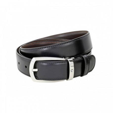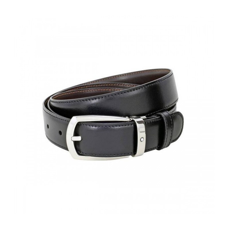 Cintura uomo elegante nera/marrone reversibile cut-to-size. Fibbia ad ardiglione oblunga a ferro di cavallo finitura palladio lucido con emblema Montblanc. Cinghia in pelle di vitello reversibile nera e marrone effetto lucido auto-regolabile, 3 cm x 120 cm.