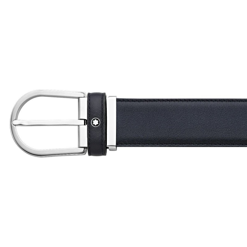Cintura Mont Blanc da uomo classica reversibile della collezione Sartorial realizzata in pelle di vitello pieno fiore blu liscia con con patina tipica della pelle dipinta a mano e una delicata gradazione di colori, fibbia ad ardiglione a forma di ferro di cavallo  in acciaio pregiato lucido e opaco,  meccanismo per la regolazione della lunghezza, emblema Mont Blanc sul passante sul passante in metallo. Le dimensioni corrispondono a 1200x35x5 mm