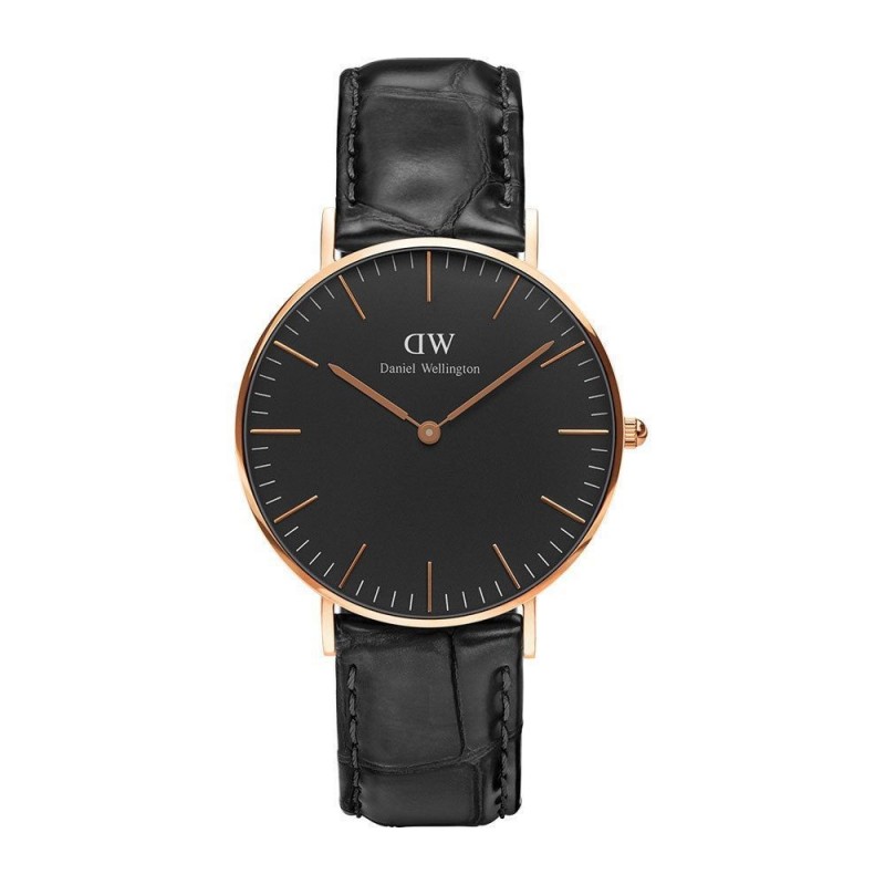 Orologio da polso femminile Daniel Wellington DW00100141. Movimento: quarzo. Orologio tondo analogico con vetro in minerale. Cassa in acciaio dorato diametro 36 mm spessore 6 e quadrante nero. Cinturino in pelle nero