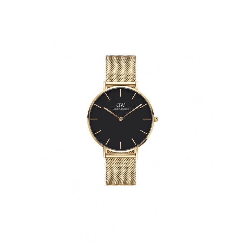 Orologio solo tempo da donna di Daniel Wellington della collezione EverOro. Orologio realizzato in acciaio inox lucidato 316l  di colore oro. La cassa ha un diametro di 36mm e spessore di 6 mm. Il quadrante di forma rotonda di colore nero con indici a bastoni color oro e due lancette, vetro minerale. Il cinturino è a maglia milano di colore oro con chiusura regolabile con doppio bottone, lunghezza cinturino: 133-204mm. Orologio con movimento al quarzo Miyota, resistente all'acqua di 3atm.