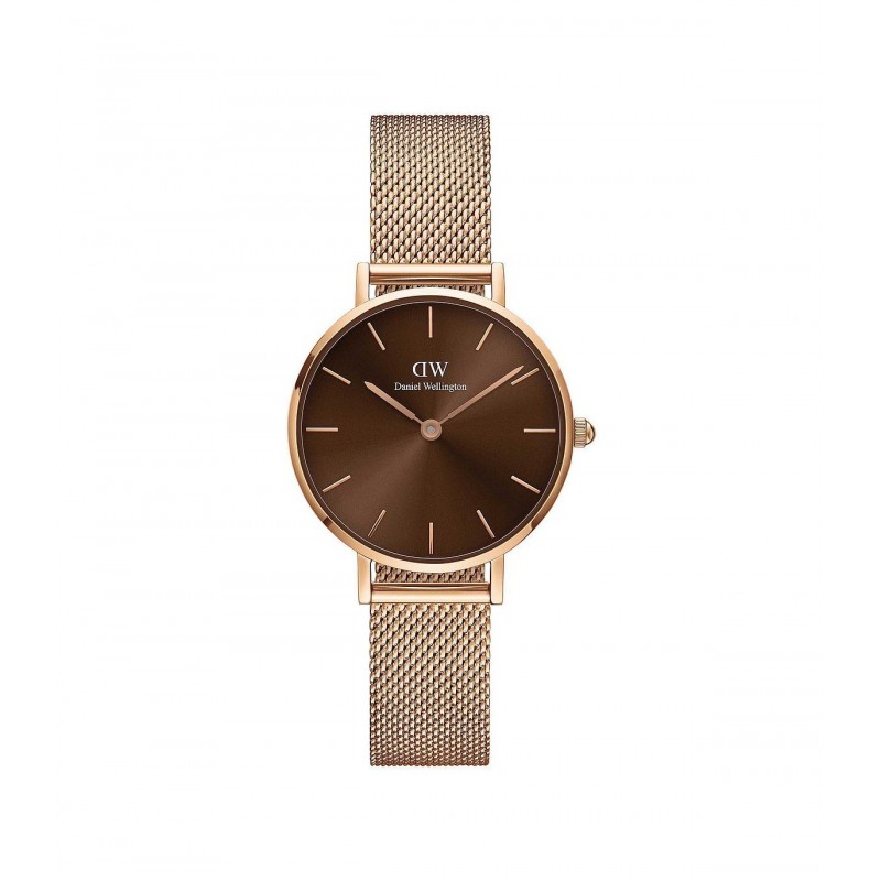 Orologio da polso donna Daniel Wellington della collezione Petit Amber con movimento al quarzo e funzioni di solo tempo. Cassa in acciaio inossidabile di forma rotonda color oro rosa e finitura lucida del diametro di 28 mm e spessore di 6mm, fondello a pressione, quadrante analogico marrone ambrato con indici a bastone color oro rosa, vetro minerale. Cinturino in acciaio inossidabile con trattamento pvd oro rosa in maglia milano largo 12 mm con chiusura regolabile a scatto e fermo di sicurezza, resistente all'acqua 3 ATM: resistente agli spruzzi d'acqua ma non sotto pressione