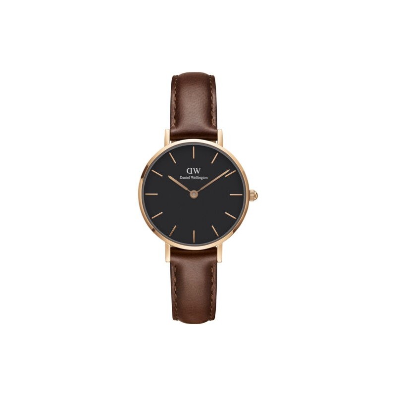 Orologio da polso donna solo tempo di Daniel Wellington della collezione Petite con movimento al quarzo Miyota. Cassa in acciaio inossidabile di forma rotonda color oro rosa del diametro di 28mm e spessore di 6mm, quadrante analogico nero con indici a bastone rosè, vetro minerale. Cinturino in pelle marrone con chiusura regolabile con fibbia ad ardiglione, resistente all'acqua 3 ATM: resistente agli spruzzi d'acqua ma non sotto pressione.