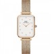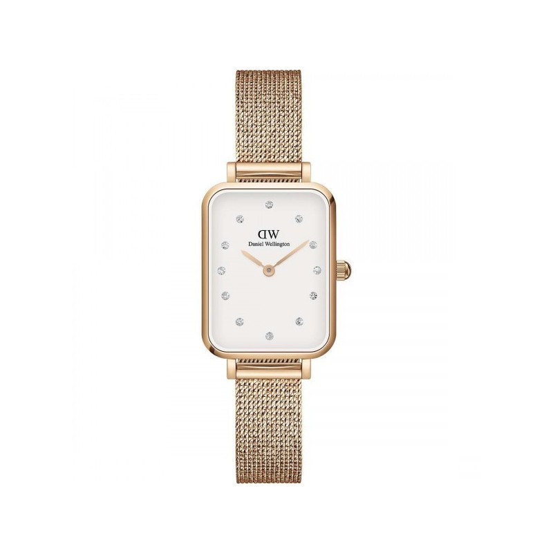 Orologio da polso donna Daniel Wellington della collezione Quadro Lumine con movimento al quarzo GL22 e funzioni di solo tempo. Cassa di forma rettangolare in acciaio inossidabile placcata oro rosa del diametro di 26 mm e spessore di 6mm, fondello in acciaio a pressione, quadrante analogico bianco con cristalli bianchi agli indici, logo sulla parte alta, vetro minerale. Cinturino in acciaio inossidabile placcato oro rosa in maglia milano con chiusura regolabile scorrevole e fermo di sicurezza, resistente all'acqua 3 ATM: resistente agli spruzzi d'acqua ma non sotto pressione.