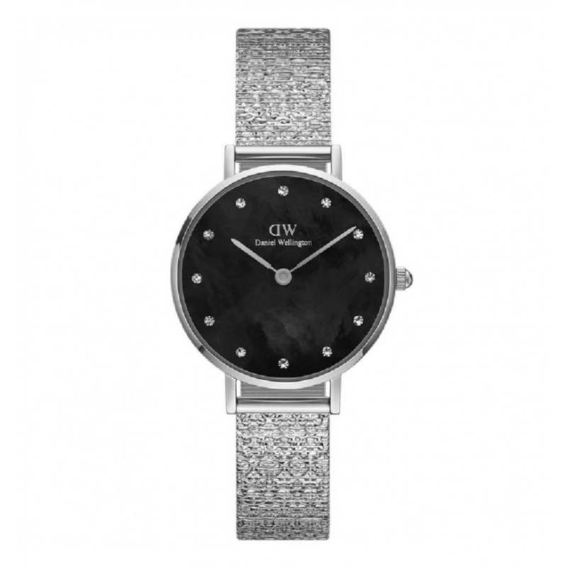 Orologio da polso donna Daniel Welligton della collezione Lumine con movimento al quarzo GL22 e funzioni di solo tempo. Cassa in acciaio inossidabile di forma rotonda color argento del diametro di 28 mm e spessore di 6 mm. Quadrante analogico in madreperla nero con indici in cristalli bianchi Preciosa, logo sulla parte alta, vetro minerale.Cinturino in acciaio inossidabile color argento in maglia milano con chiusura scorrevole regolabile e fermo di sicurezza, resistente all'acqua 3 ATM: resistente agli spruzzi d'acqua ma non sotto pressione.