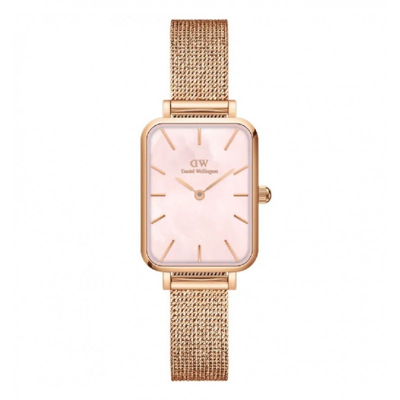 Orologio da polso donna Daniel Wellington della collezione Quadro con movimento al quarzo e funzione di solo tempo. Cassa in acciaio inossidabile di forma rettangolare color oro rosa del diametro di 26 mm e spessore di 6 mm, fondello in acciaio a pressione. Quadrante analogico in madreperla rosa e indici a bastone color oro rosa, logo sulla parte alta, vetro minerale. Cinturino in acciaio,inossidabile in maglia milano color oro rosa con chiusura scorrevole regolabile a clip, resistente all'acqua 3 ATM: resistente agli spruzzi d'acqua ma non sotto pressione.