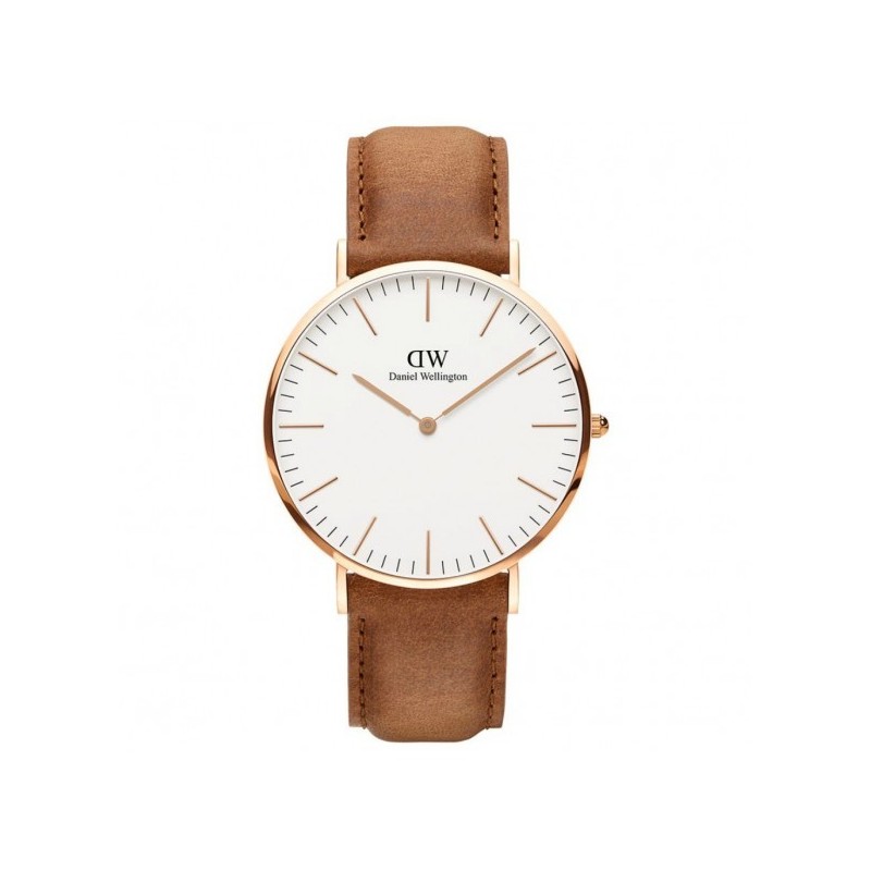 Orologio da polso uomo Daniel Wellington della collezione Classic con movimento al quarzo e funzione di solo tempo. Cassa in acciaio inossidabile di forma rotonda color oro rosa del diametro di 40 mm e spessore di 6 mm, fondello in acciaio a pressione. Quadrante analogico bianco con indici a bastone color oro rosa, logo sulla parte alta, vetro minerale. Cinturino in pelle marrone chiaro con chiusura fibbia ad ardiglione, resistente all'acqua 3 ATM: resistente agli spruzzi d'acqua ma non sotto pressione.