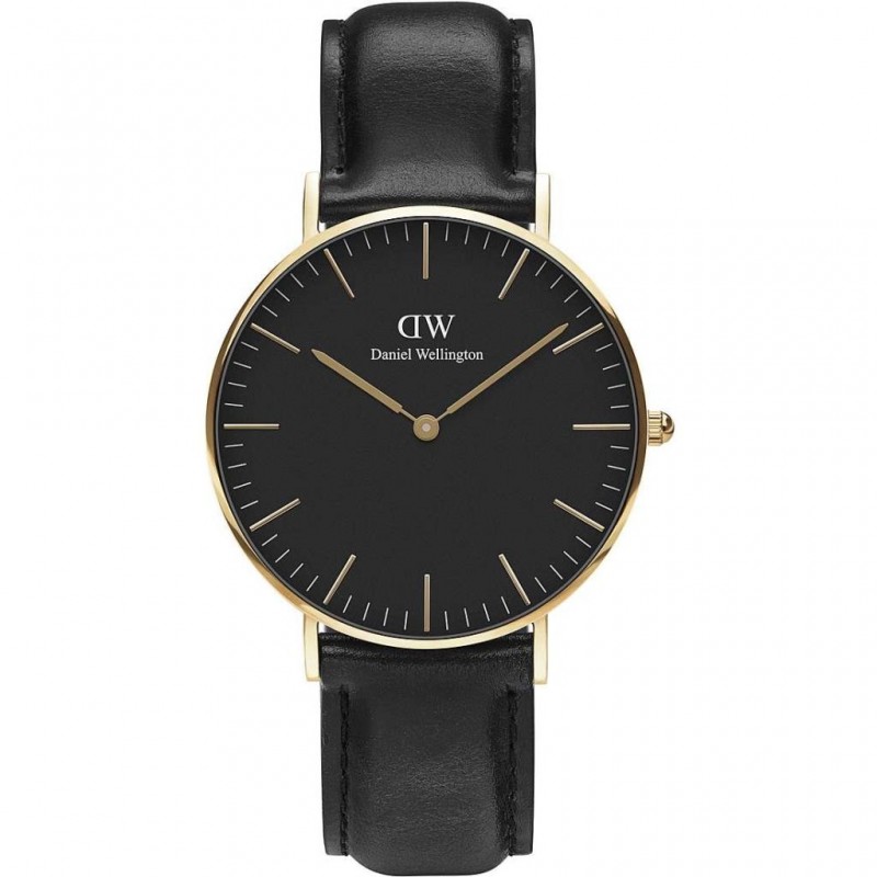Orologio da polso donna Daniel Wellington della collezione Classic Sheffield con movimento al quarzo e funzione di solo tempo. Cassa in acciaio inossidabile di forma rotonda color oro del diametro di 36 mm e spessore di 6 mm, fondello in acciaio a pressione. Quadrante analogico nero con indici a bastone color oro, logo sulla parte alta, vetro minerale. Cinturino in pelle nero con chiusura fibbia ad ardiglione, resistente all'acqua 3 ATM: resistente agli spruzzi d'acqua ma non sotto pressione.