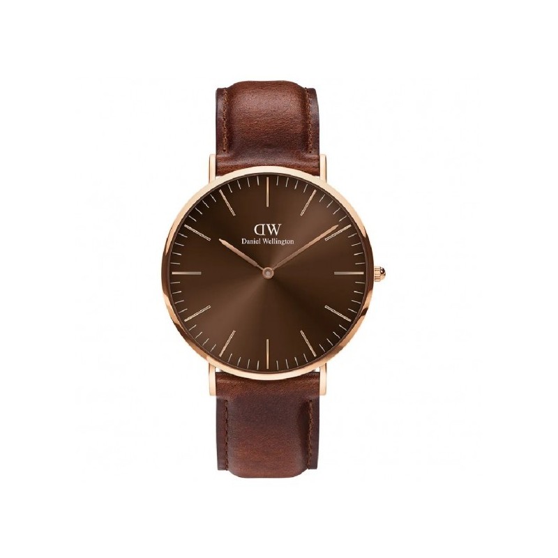 Orologio da polso uomo Daniel Wellington della collezione Classic con movimento al quarzo e funzione di solo tempo. Cassa in acciaio inossidabile di forma rotonda color oro rosa del diametro di 40 mm e spessore di 6 mm, fondello in acciaio a pressione. Quadrante analogico color ambra con indici a bastoni, logo sulla parte alta, vetro minerale. Cinturino in pelle marrone con chiusura fibbia ad ardiglione, resistente all'acqua 3 ATM: resistente agli spruzzi d'acqua ma non sotto pressione.