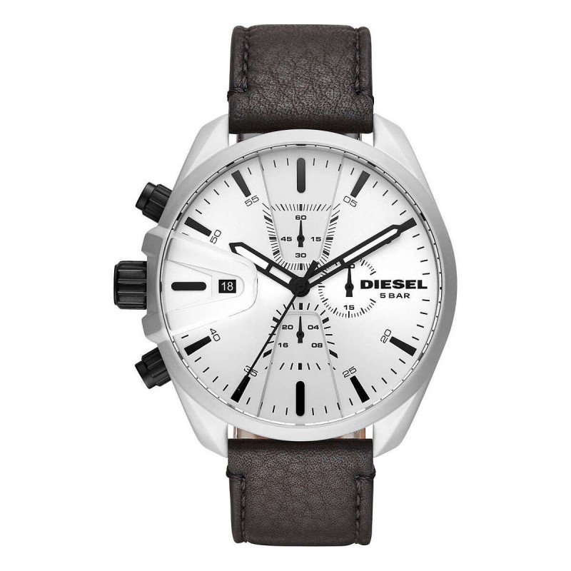 Orologio da polso uomo Diesel della collezione Ms9 con movimento al quarzo e funzione di cronografo con data. Cassa in acciaio inossidabile di forma rotonda color argento finitura satinata del diametro di 48 mm e spessore di 14 mm, quadrante analogico grigio con indici a bastone neri, datario sulle ore 9, vetro minerale. Cinturino in pelle nero con chiusura fibbia ad ardiglione, resistente all'acqua 5 ATM: resistente agli spruzzi d'acqua ma non sotto pressione.