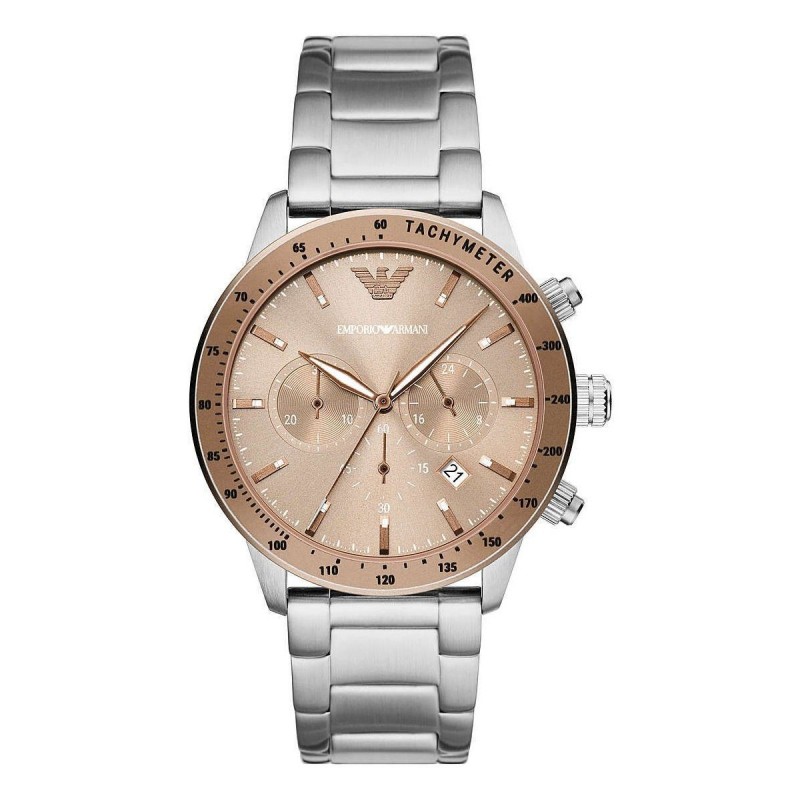 Orologio Cronografo da uomo Emporio Armani della collezione Mario, cassa in Acciaio Inossidabile da 43mm di diametro, quadrante analogico di colore oro rosa con indici a bastone color oro rosa, funzione data e cronografo, vetro minerale, cinturino in acciaio Inossidabile di colore argento con chiusura deployante e fermo di sicurezza, movimento al quarzo alimentato da batteria, resistente all'acqua 3 ATM, quindi resiste agli spruzzi d'acqua ma non alla pressione dell'acqua (come sotto la doccia o durante un tuffo)