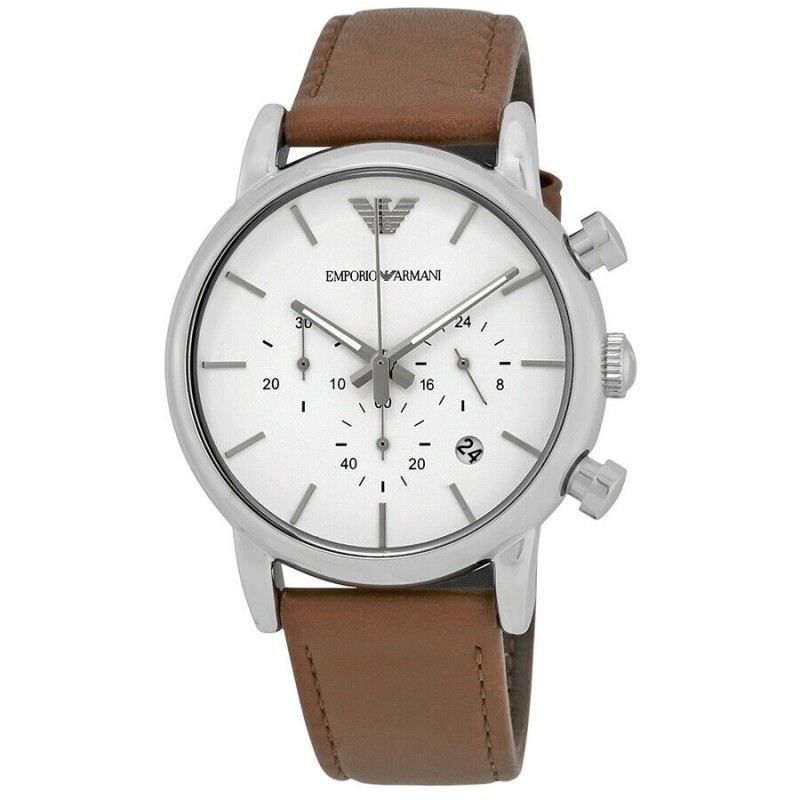 ShippingOrologio da polso elegante Emporio Armani Cronografo uomo con movimento al quarzo, cassa in acciaio inossidabile di diametro 41 mm, quadrante bianco, vetro minerale e cinturino in pelle di vitello di colore marrone.