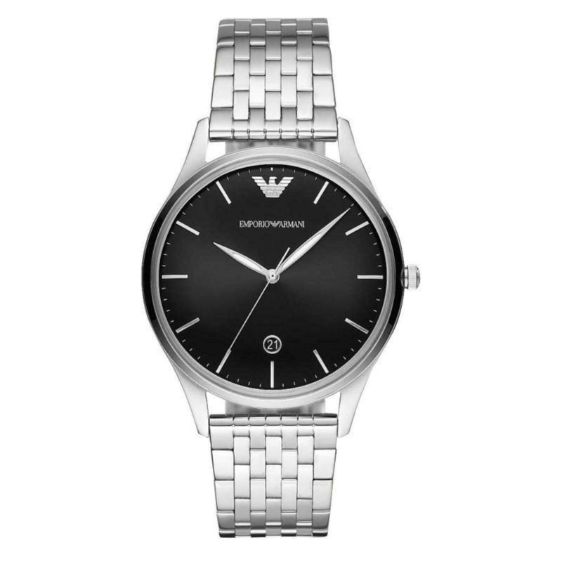 ShippingOrologio Uomo Emporio Armani con cassa in acciaio inossidabile di 41 mm, quadrante nero con indici a bastoni e cinturino in acciaio. Movimento al quarzo e resistenza all’acqua di 5 atmosfere.