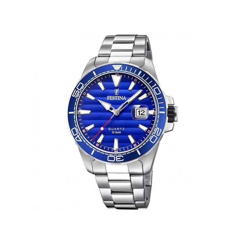 Orologio da polso Festina uomo della collezione Prestige con movimento al quarzo Miyota 2315 e funzioni di solo tempo con data. Cassa in acciaio inossidabile color argento del diametro di 44,3 mm e spessore di 12,3 mm, fondello a vite, ghiera blu con minutiera, quadrante analogico blu con indici a bastone e datario alle ore 3,logo sulla parte alta, vetro minerale. Cinturino in acciaio inossidabile color argento con chiusura deployante con pulsanti, resistente all'acqua 10 ATM.
