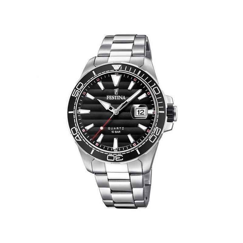 Orologio da polso Festina uomo della collezione Prestige con movimento al quarzo Miyota 2315 e funzioni di solo tempo con data. Cassa in acciaio inossidabile color argento del diametro di 44,3 mm e spessore di 12,3 mm, ghiera unidirezionale in acciaio nera con minutiera, quadrante analogico nero con indici a bastoni, datario alle ore 3, logo nella parte alta, vetro di tipo minerale, fondello a vite. Cinturino in acciaio inossidabile color argento con chiusura deployante con pulsanti, resistenza all'acqua 10 ATM.