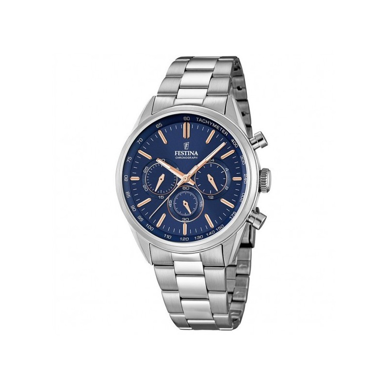 Orologio da polso Festina uomo della collezione Timeless con movimento al quarzo Miyota JS10 e funzioni di cronografo con data. Cassa in acciaio inossidabile del diametro di 42mm e spessore di 10,9 mm, fondello in acciaio, quadrante analogico blu con indici a bastone rosè,logo sulla parte alta, vetro minerale. Cinturino in acciaio inossidabile color argento con chiusura deployante con pulsanti, resistenza all'acqua 5ATM: resistente agli spruzzi d'acqua ma non sotto pressione