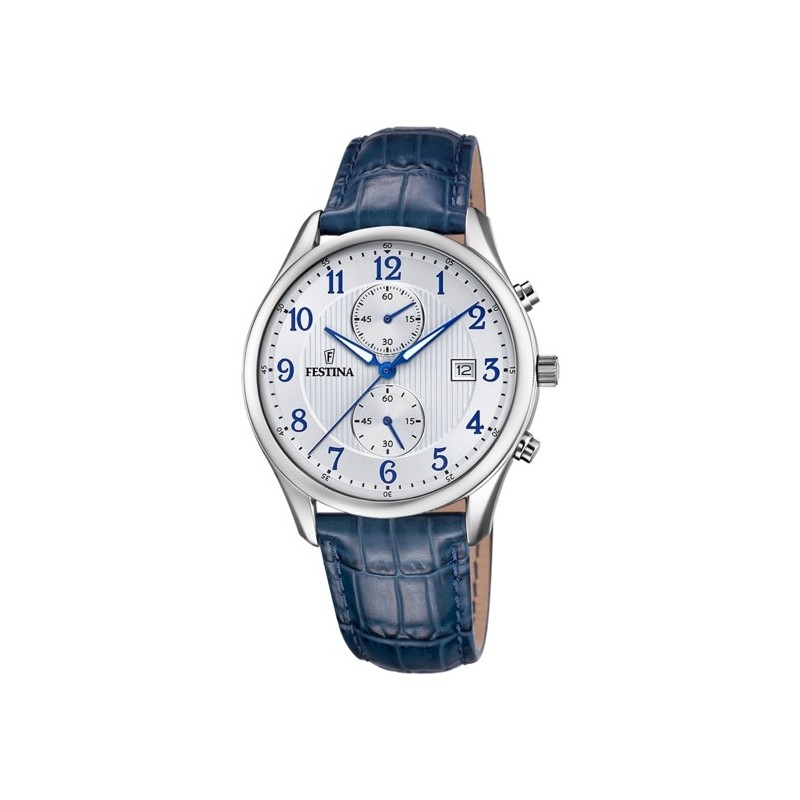 Orologio da polso uomo Festina della collezione Timeless Chronograph con movimento al quarzo e funzione di cronografo con data. Cassa in acciaio inossidabile color argento di forma rotonda del diametro di 42 mm e spessore di 10,2 mm, fondello in acciaio. Quadrante analogico bianco con indici azzurri in numeri arabi, datario sulle ore 3, logo sulle ore 9, vetro minerale. Cinturino in pelle blu con chiusura fibbia ad ardiglione, resistente all'acqua 3 ATM: resistente agli spruzzi d'acqua ma non sotto pressione.