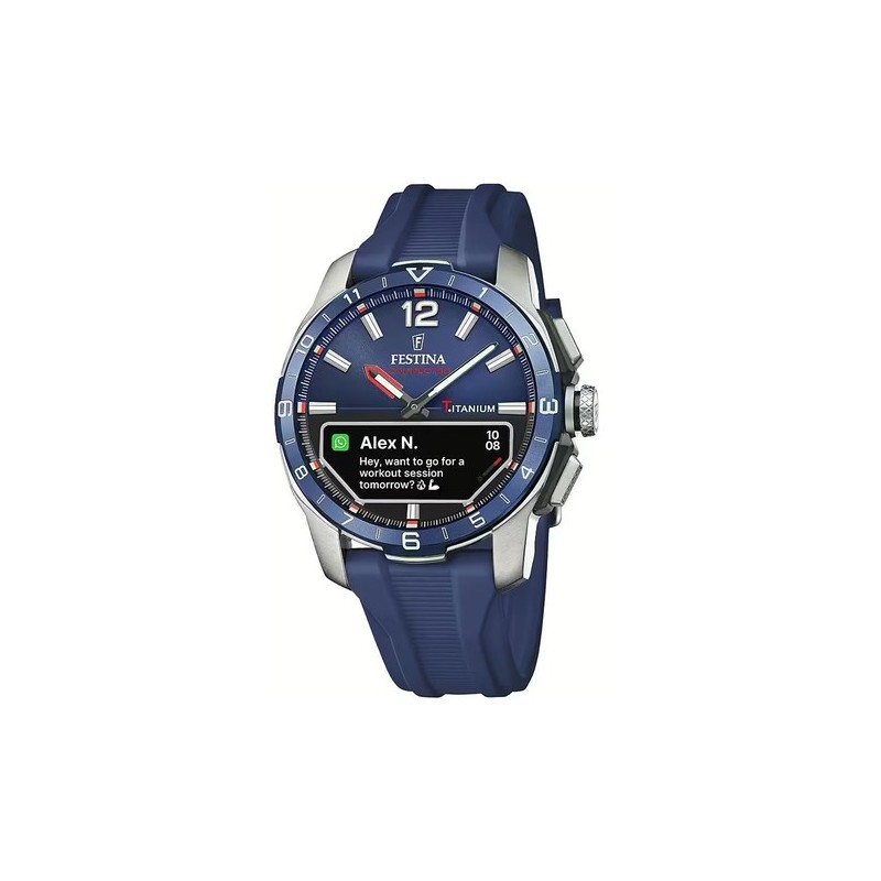 Orologio da polso uomo Festina analogico digitale uomo della linea Connected D. Cassa in Titanio di forma rotonda color argento del diametro di 44 mm e spessore di 13,96 mm. Quadrante blu analogico con display digitale OLED (no touch screen), vetro zafffiro, connessione con lo smartwatch attraverso l'app dedicata, tasti laterali programmabili. Funzioni Principali Controllo della musica, controllo della fotocamera, trova il mio telefono, portami a casa, ricorda questo posto, IFTT, Meteo, ora mondiale, timer, cronometro, allarmi. Cinturino in gomma blu con chiusura ad ardiglione, resistente all'acqua 3 ATM: resistente agli spruzzi d'acqua ma non sotto pressione.