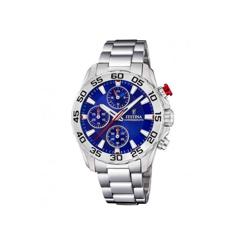 Orologio da polso bambino Festina della collezione Junior con movimento al quarzo e funzione di cronografo. Cassa in acciaio inossidabile color argento di forma rotonda del diametro di 37 mm e spessore di 10,65 mm, lunetta in acciaio color argento con minutiera. Quadrante analogico blu con indici a bastone, logo sulle ore 3, dettagli con il rosso, vetro minerale. Cinturino in acciaio inossidabile color argento con chiusura deployante con pulsanti, resistente all'acqua 5 ATM: resistente agli spruzzi d'acqua ma non sotto pressione.