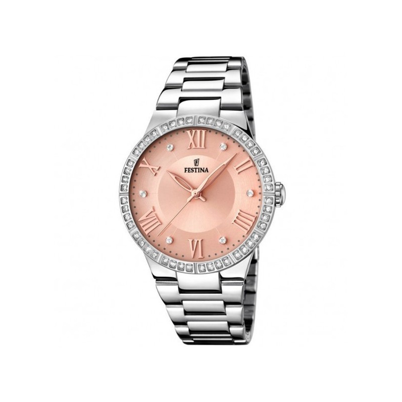 Orologio da polso donna Festina della collezione Boyfriend con movimento al quarzo e funzioni di solo tempo. Cassa in acciaio inossidabile color argento di forma rotonda del diametro di 36 mm e spessore di 8,8 mm, impreziosita da contorno di cristalli bianchi. Quadrante analogico rosa con indici misti in numeri romani e cristalli bianchi, logo sulla parte alta, vetro minerale. Cinturino in acciaio inossidabile color argento con chiusura deployante con pulsanti, resistente all'acqua 5 ATM: resistente agli spruzzi d'acqua ma non sotto pressione.