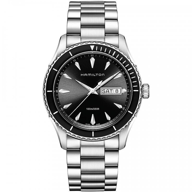 Orologio Solo Tempo Da Uomo Di Hamilton Della Collezione Jazzmaster, Modello: Seaview Day Date. Orologio Con Cassa In Acciaio Del Diametro Di 42 Mm E Altezza Di 10.85 Mm. Il Quadrante È Di Colore Nero. Il Cinturino È In Acciaio Con Chiusura Pieghevole. Vetro: Zaffiro Con . Calibro: 955122. La Resistenza All'Acqua È Di 10 Atm. Il Movimento È Quarzo.