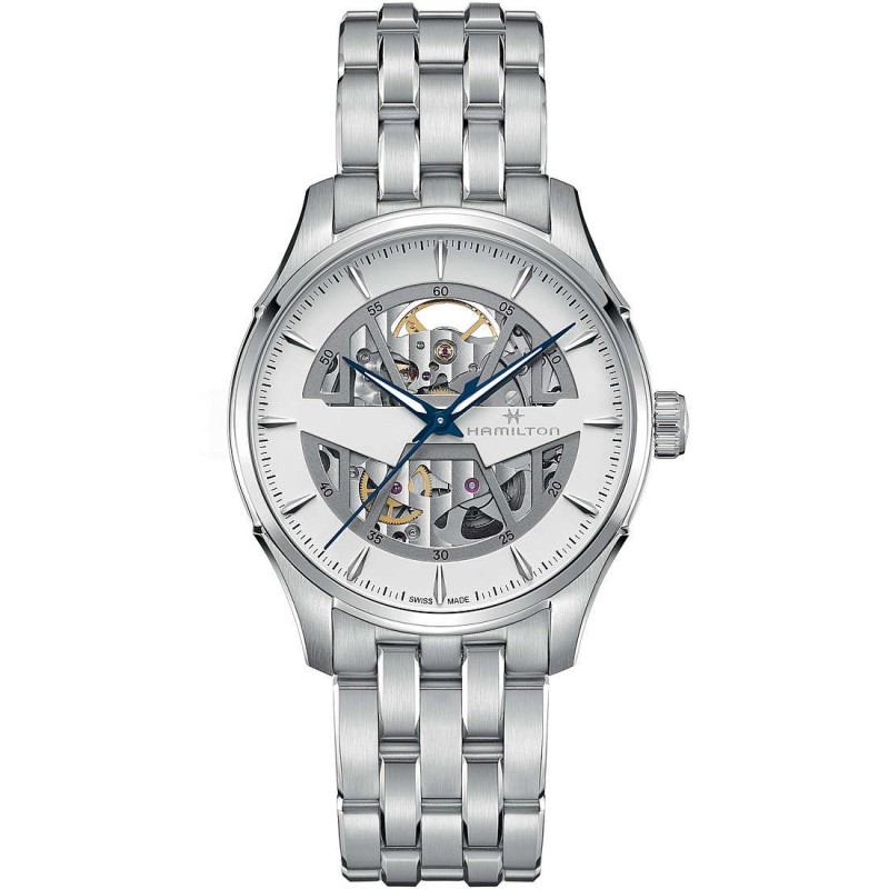 Orologio Automatico Da Uomo Di Hamilton Della Collezione Jazzmaster. Modello: Skeleton. Orologio Con Movimento Automatico E Calibro H-10-S. La Riserva Di Carica È 80H E Minima Di 75H.. La Cassa È Realizzata In Acciaio Inossidabile Con Dimensione Di 40.00 Mm E Spessore Di 11.05. La Corona È Standard.. La Resistenza All'Acqua È Di 5 Bar. Il Vetro È Realizzato Con Zaffiro Con Rivestimento Singolo. Il Quadrante È Di Colore Bianco. Il Bracciale È Realizzato In Acciaio Inossidabilela Chiusura È A Chiusura Pieghevole. La Larghezza Dell'Ansa È Di 20.00 Mm.