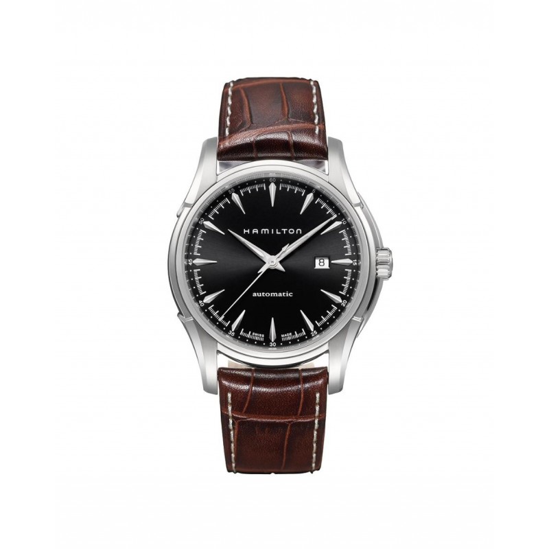 Orologio Hamilton uomo automatico della collezione Jazzmaster viewmatic con cassa in acciaio, finitura lucida alternta del diametro di 44mm e altezza di 10,4 mm,quadrante di colore nero, lunetta in acciaio e finitura lucida. Quadrante analogico nero con indici applicati e lancette color argento lucido a contrasto, funzione data e vetro zaffiro. Il cinturino è in pelle di coccodrillo marrone con chiusura ad ardiglione.Il movimento è automatico con riserva di carica di 38 ore, resistente all'acqua 10 ATM