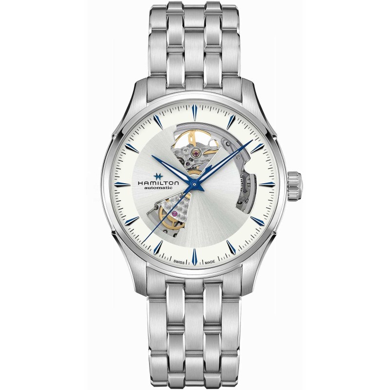 Orologio automatico da uomo di Hamilton della collezione jazzmaster. Orologio modello open heart di calibro c07. 601 con riserva di carica di 80h. Cassa realizzata in acciaio color argento con corona di tipo standard. La cassa ha diametro 40 mm Movimento automatico. Il vetro è zaffiro con trattamento antiriflesso su un lato. Il quadrante è di colore argento con indici a bastone blu senza numeri con movimento a vista. Bracciale realizzato in acciaio di colore argento con chiusura a farfalla Resistenza all'acqua: 5 ATM. Certificato swiss made