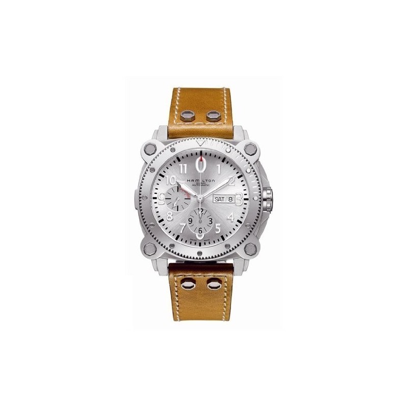 Orologio da polso uomo Hamilton della collezione Khaki Navy con movimento automatico e funzione di solo tempo con data. Cassa in acciaio inossidabile color argento di forma rotonda del diametro di 46 mm e spessore di 17 mm, quadrante analogico argento con indici in numeri arabi, datario sulle ore 3, logo sulla parte alta, vetro zaffiro. Cinturino in pelle color cuoio con chiusura fibbia ad ardiglione, resistente all'acqua 20 ATM.