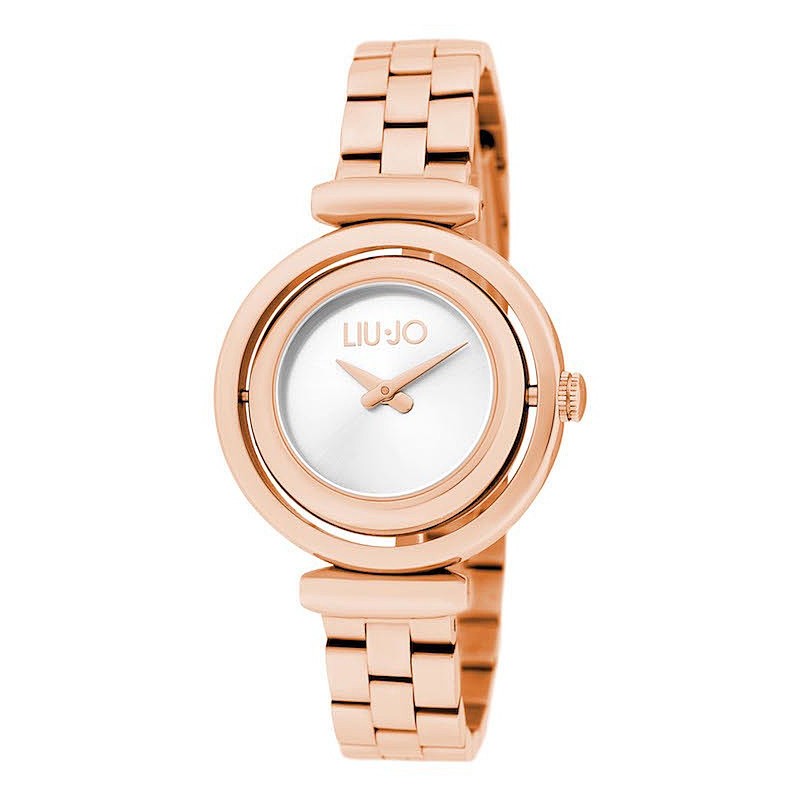 Orologio da donna con movimento al quarzo GL22 e funzioni di solo tempo. Cassa rotonda in acciaio anallergico placcato oro rosa dal diametro di 32 mm. Quadrante analogico bianco con logo nella parte alta. Cinturino a maglie in acciaio anallergico rose gold. Chiusura con pulsanti. Resistente all'acqua fino a 30 metri di profondità. Appartiene alla collezione Double-Side.