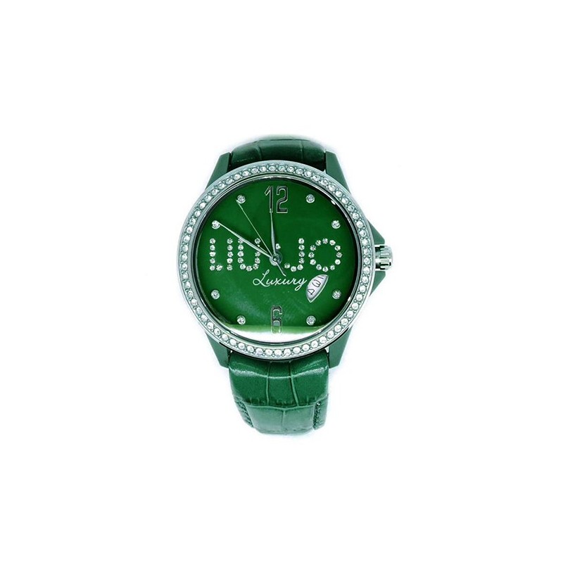 Orologio Liu Jo donna della collezione Colortime regular con movimento al quarzo, cassa in policarbonato color verde mm 37 , quadrante verde con funzione solo tempo, display analogico con lunetta in acciaio con cristalli bianchi, vetro minerale, indici e logo in cristalli bianchi, resistente all'acqua 5 ATM, cinturino in pelle colorata verde stampa cocco.