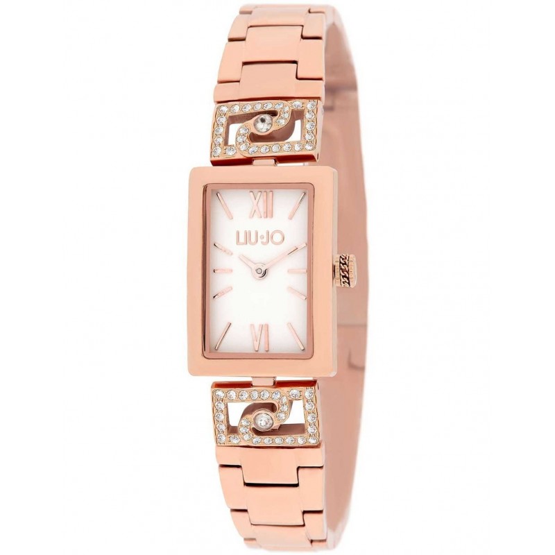 Orologio da polso solo tempo da donna di Liu Jo della collezione Mayfair con movimento al quarzo miyota cal.2025. Cassa squadrata in acciaio inox placcato oro rosa dalle dimensioni di 28,5mm x 20 mm. Quadrante analogico bianco con indici a bastoni e numero romano a ore 12, vetro minerale. Cinturino in acciaio anallergico oro rosa con maglie agli estremi impreziosite da zirconi bianchi, chiusura regolabile e fermo di sicurezza Resistenza all'acqua 3 ATM: resistente agli spruzzi d'acqua ma non sotto pressione.