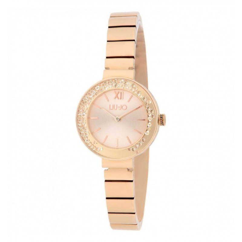 Orologio da polso donna Liu Jo della collezione Dancing con movimento Miyota 2025 al quarzo e funzioni di solo tempo. Cassa rotonda in acciaio inox placcato oro rosa dal diametro di 28 mm. Quadrante analogico rose' con indici a bastoni e numero romano a ore 12. Lunetta impreziosita da cristalli bianchi in movimento, vetro minerale. Cinturino in acciaio anallergico oro rosa con chiusura regolabile e fermo di sicurezza. Resistente all'acqua 3 ATM: resistente agli spruzzi d'acqua ma non sotto pressione.