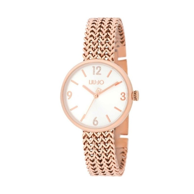 Orologio da polso donna da donna di Liu Jo della collezione Encadrè con movimento al quarzo miyota gl32. Cassa in acciaio IP oro rosa del diametro di 32,5 mm. Fondo in acciaio serrato a pressione. Vetro minerale. Corona di regolazione in acciaio serrata a pressione. Ghiera in acciaio IP oro rosa. Quadrante analogico bianco con indici misti a bastone e numeri arabi. Cinturino a maglia lavorata a spiga in acciaio IP oro rosa con chiusura regolabile. Resistente all'acqua 3 ATM: resistente agli spruzzi d'acqua ma non sotto pressione