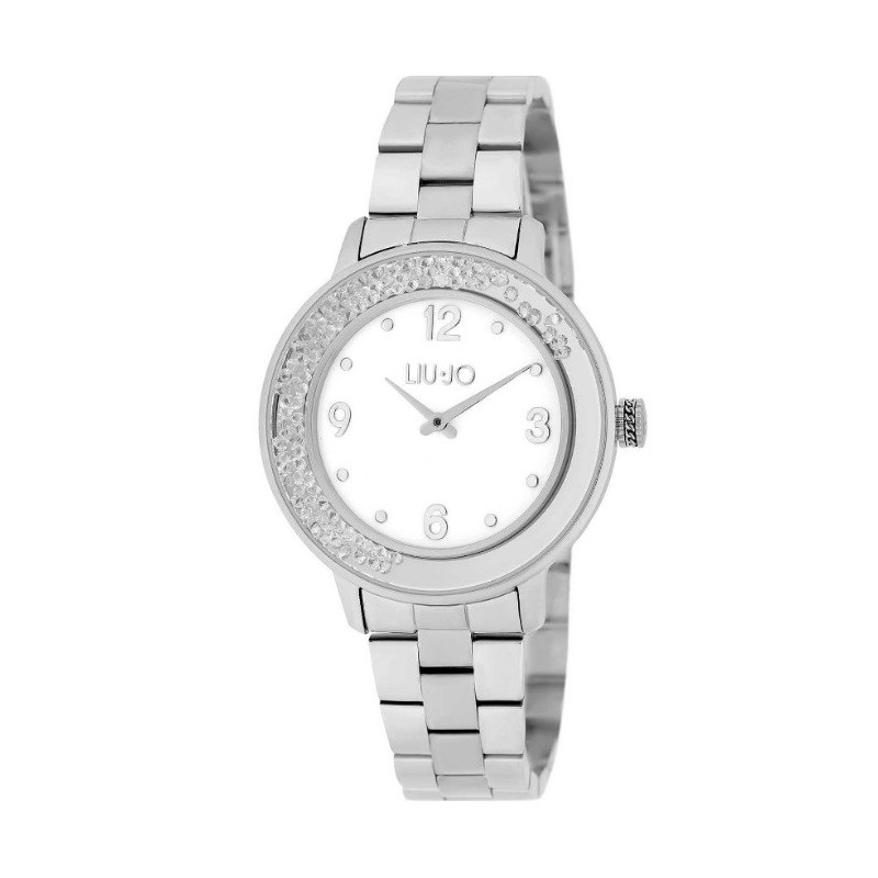 Orologio da polso donna Liu Jo della collezione Dancing 2.0 con movimento al quarzo Miyota cal.2025 e funzione di solo tempo. Cassa in acciaio inossidabile di forma rotonda color argento del diametro di 36 mm, quadrante analogico argento bianco brillante con cristalli bianchi sfusi in lunetta, indici misti geometrici e numeri arabi color argento, logo sulla parte alta, vetro minerale. Cinturino in acciaio inossidabile color argento con chiusura deployante, resistente all'acqua 5 ATM: resistente agli spruzzi d'acqua ma non sotto pressione.