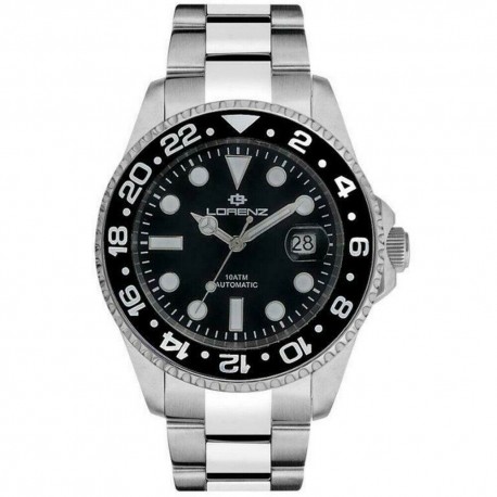 Orologio da Uomo Lorenz Automatico Ginevra GMT 026961DD. Un orologio da polso sportivo con movimento automatico. Cassa in acciaio da 42 mm. Ghiera zigrinata girevole unidirezionale di colore nero. Vetro minerale con zoom sul datario. Quadrante nero con indici e sfere trattate con luminos. Datario a ore tre. Corona a vite con carica meccanica. Fondello in acciaio serrato a vite. Questo orologio Lorenz da uomo ha un robusto cinturino in acciaio con chiusura deployante. Resistente all'acqua 10 atm, quindi impermeabile fino a 100 metri.