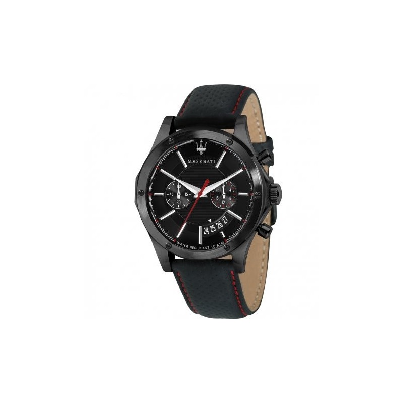 ShippingOrologio Cronografo Da Uomo Di Maserati Della Collezione Circuito. Orologio Con Cassa Acciaio E Pvd Nero, Satinato Verticalmente, Della Dimensione Di 49X44 E Dello Spessore Di 11,45 Mm. Orologio Con Bracciale In Pelle Di Colore Nero E Fibbia Ardiglione. Modello Con Vetro Minerale E Resistenza All'Acqua Di 10 Atm.