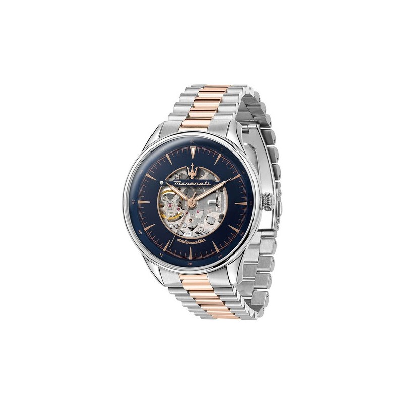 Orologio da polso Maserati da uomo della collezione Tradizione con movimento automatico SEIKO NH70 con rotore personalizzato e funzioni di solo tempo. Cassa in acciaio inossidabile argento del diametro di 45 mm, quadrante analogico blu con movimento a vista, indici a bastoni color oro rosa e vetro curvo. Cinturino bicolore in acciaio inossidabile argento e oro rosa e chiusura deployante con pulsanti. Resistente all'acqua fino a 10 ATM.