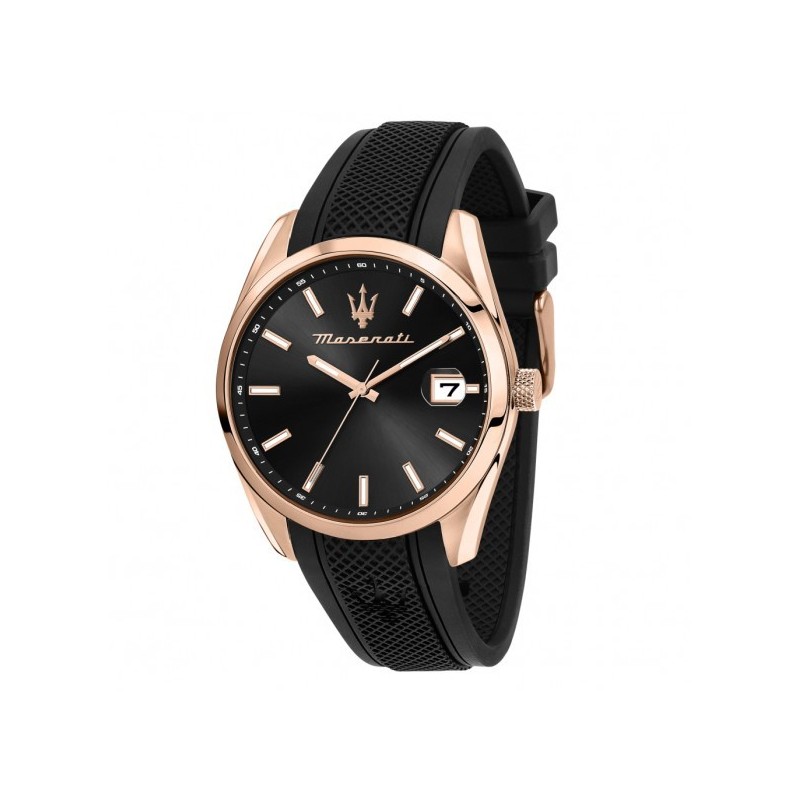 Orologio da polso uomo Maserati della collezione Attrazione con movimento al quarzo Miyota 2415 e funzioni di solo tempo con data. Cassa in acciaio inossidabile color oro rosa del diametro di 43mm, quadrante analogico nero con indici a bastoni, logo a ore 12 e datario a ore 3 con lente di ingrandimento, vetro minerale. Cinturino in silicone nero con chiusura fibbia ad ardiglione, resistente all'acqua 5 ATM: resistente agli spruzzi d'acqua ma non sotto pressione.