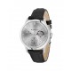 Orologio da polso uomo Maserati della collezione Ricordo con movimento al quarzo e funzione di cronografo con data. Cassa in acciaio inossidabile di forma rotonda color argento finitura lucida del diametro di 42 mm e spessore di 8,40 mm, quadrante analogico argento bianco brillante con indici a bastoni, datario tra le ore 4 e 5, logo sulla parte alta, vetro minerale. Cinturino in pelle nero con chiusura fibbia ad ardiglione, resistente all'acqua 5 ATM: resistente agli spruzzi d'acqua ma non sotto pressione.